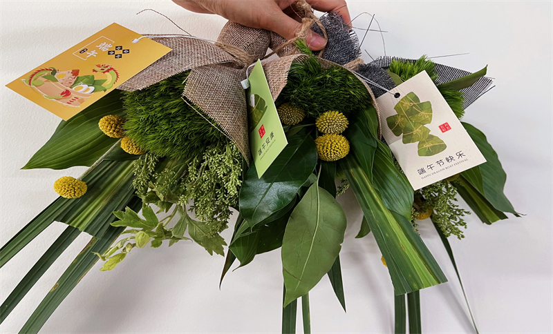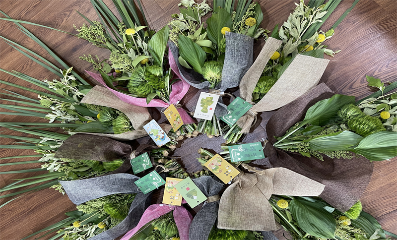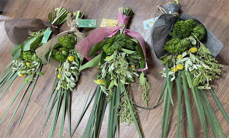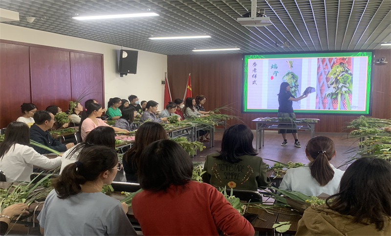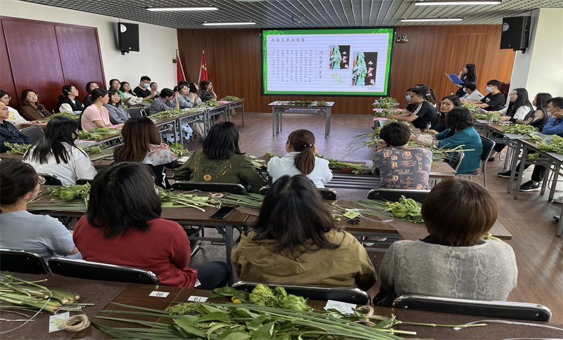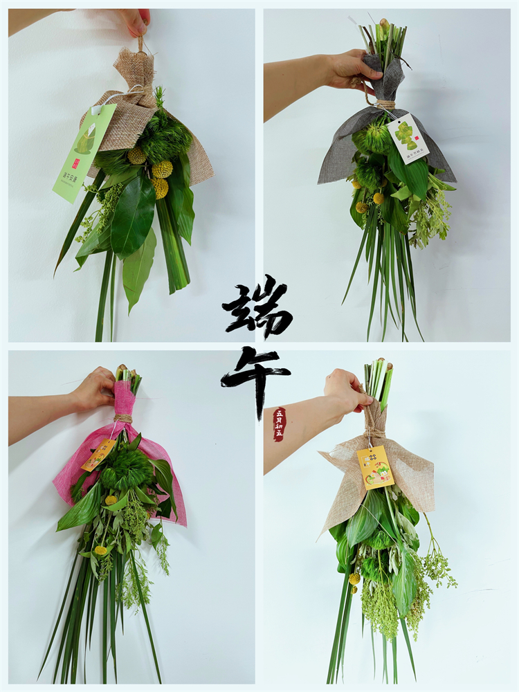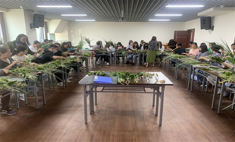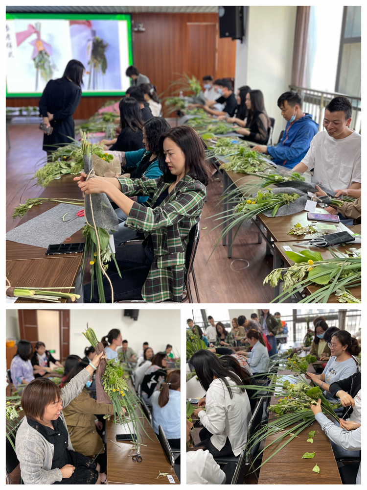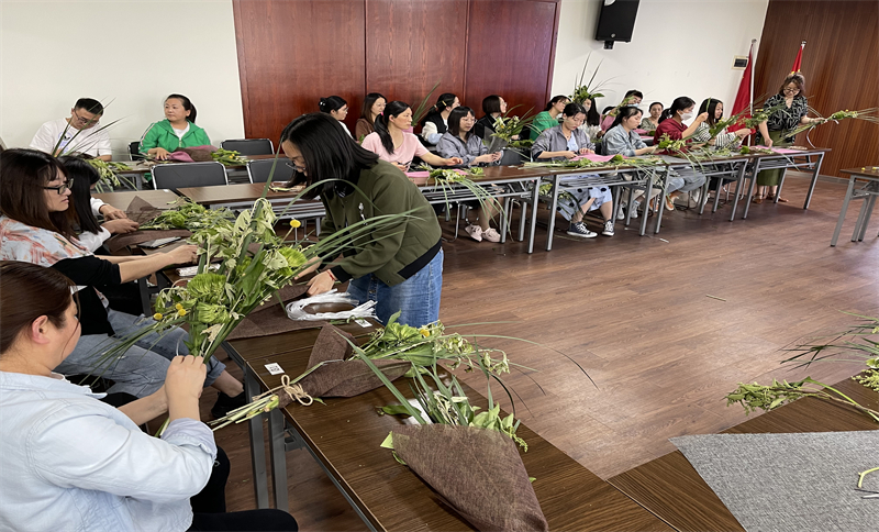 由工会会员代表现场教学,参与人员自己动手制作菖蒲艾草祈福花束。现场一片热闹祥和的气氛。