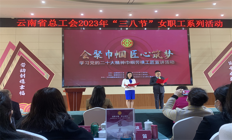 2023年3月2日上午9:00--11:00,为认真学习宣传贯彻落实党的二十大精神,在“三八”国际妇女节到来之际,由云南省总工会主办、昆明市总工会承办、石林县总工会协办了“会聚巾帼·匠心筑梦”一一学习党的二十大精神巾帼劳模工匠宣讲会。