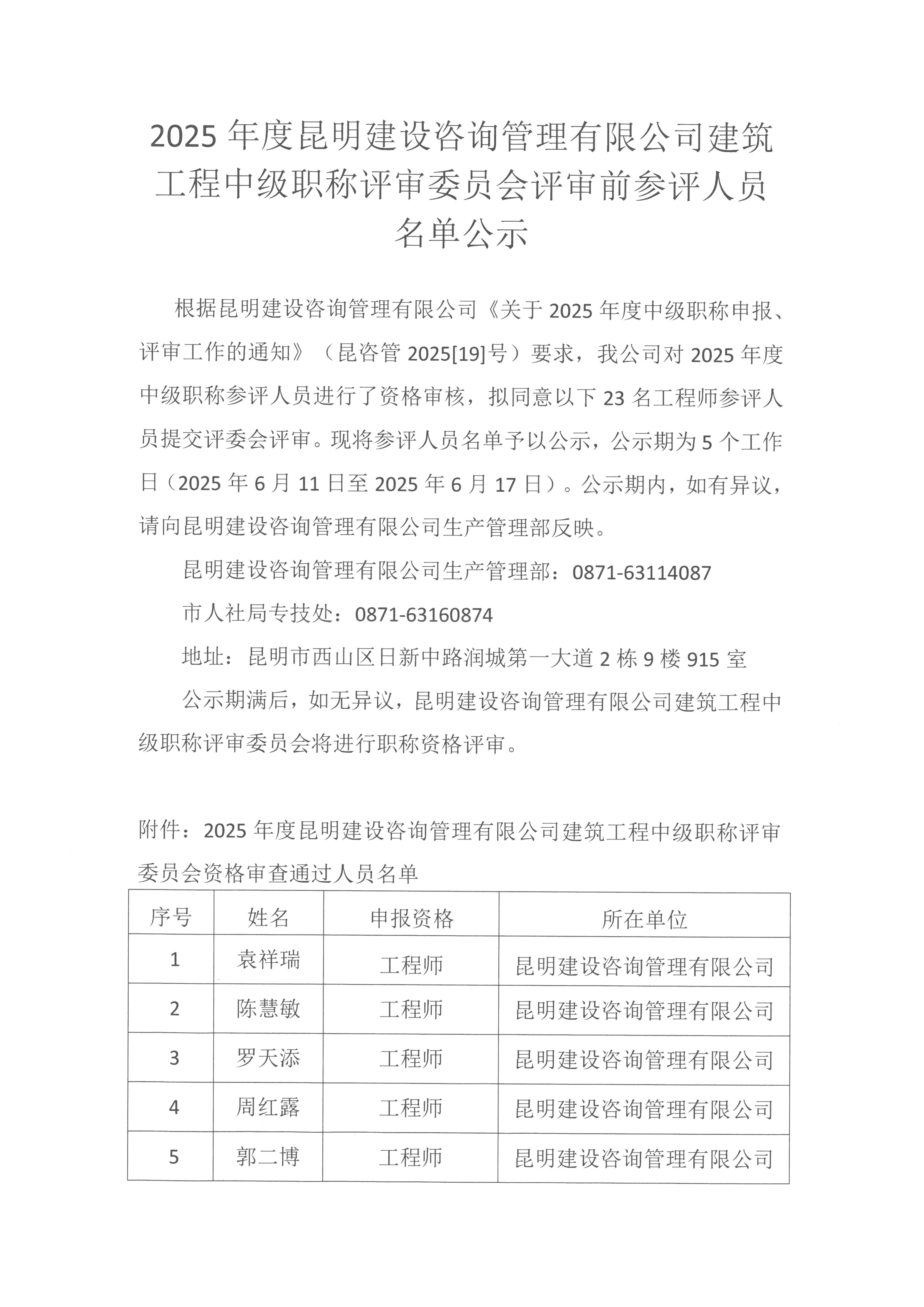 2025年度九游·官方版web站入口建筑工程中级职称评审委员会评审前参评人员名单公示
